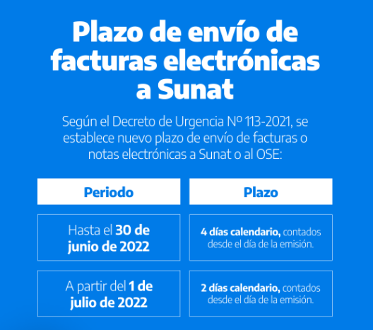 A través del Decreto de Urgencia N° 113-2021, se determinó la ampliación del plazo de envío de facturas electrónicas a la Sunat o al OSE (Operador de Servicios Electrónicos). El plazo anterior era hasta el 31 de diciembre de 2021 y ahora será hasta el 30 de junio de 2022.
